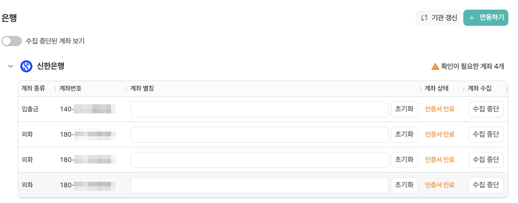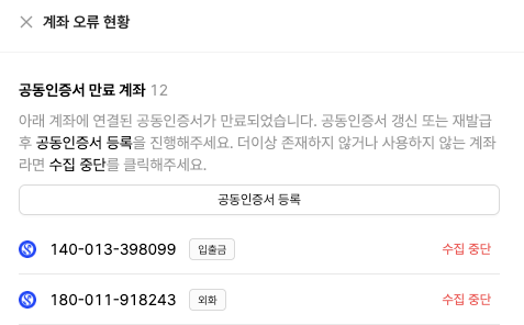 인증서가 만료되었을 경우, 아래와 같은 화면에서 '공동인증서 등록'을 클릭하시어 새로운 인증서를 등록해 주세요. 만약 사용하지 않는 계좌라면 '수집 중단' 버튼을 클릭해 주세요.