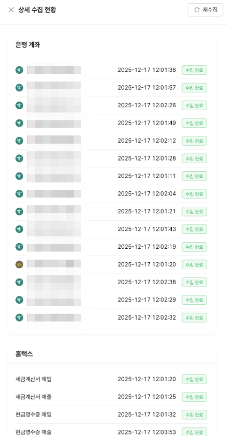 추가로, 알림(예: 계좌 입출금, 세금계산서 등) 설정이 켜진 회사의 경우, 평일 오전 8시~오후 8시 사이에 매시 정각에 자동으로 데이터가 수집됩니다.