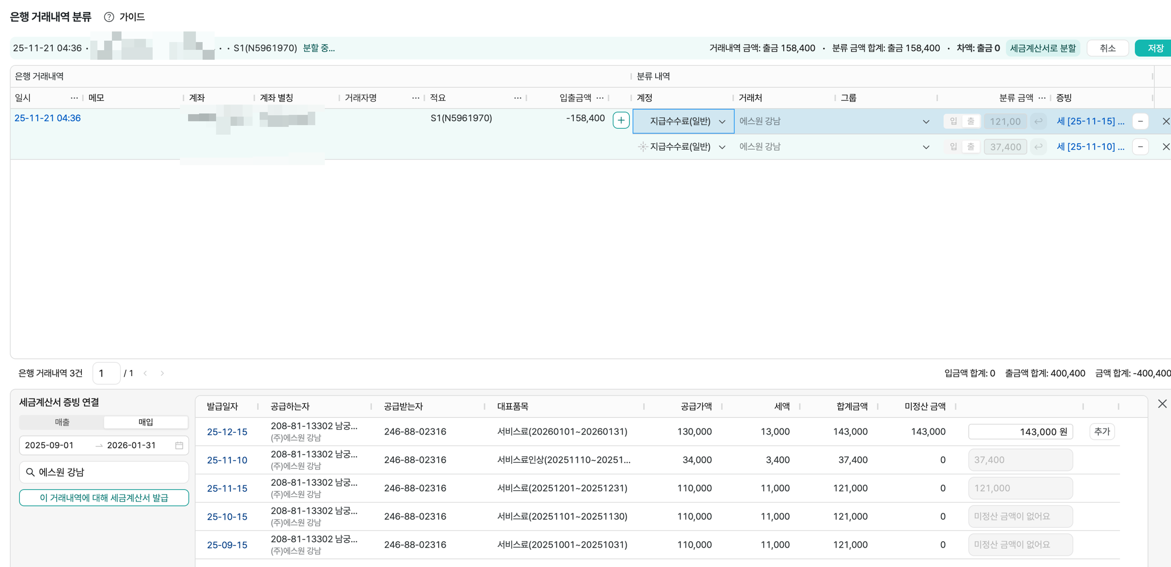 • 입출금 구분: 매출 세금계산서는 입금, 매입 세금계산서는 출금으로 자동 설정