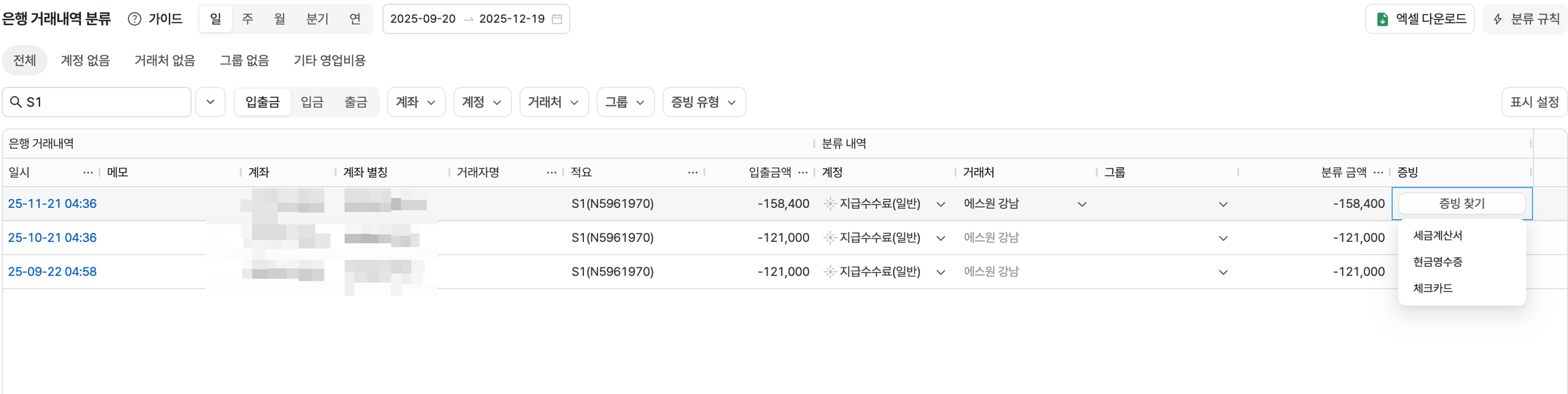 • 거래내역 테이블에서 "증빙 찾기" 버튼을 클릭합니다
